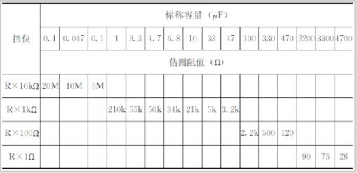 根据电容充放电原理,通过观察万用表指针的偏转角度来估计电容容量。测试时,首先根据被测电容容量选择万用表电阻挡,见表1;然后采用反复调换表笔使电容进行充电的方法进行测量,直到比较准确地记下指针向右偏转最大位置时对应的阻值为止。此法也可定性地比较电容容量的大小:指针向右摆的幅度越大,容量就越大。